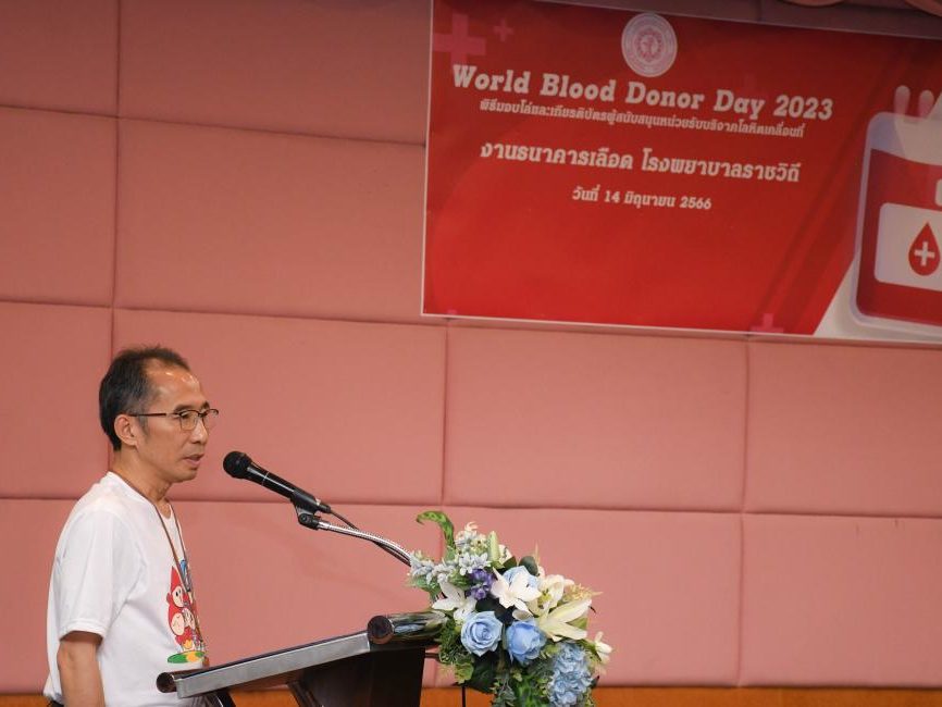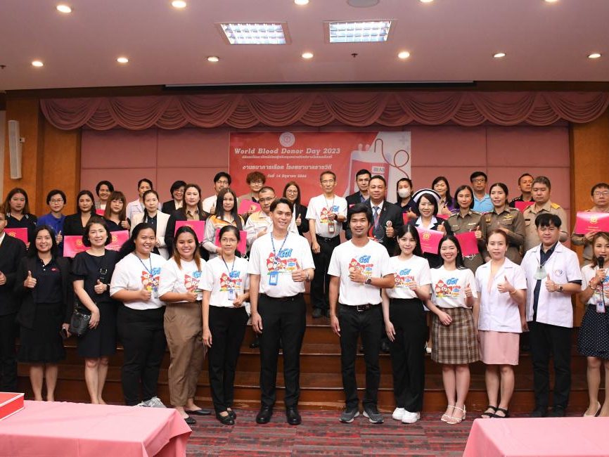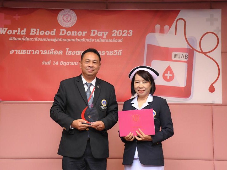 – วันที่ 14 มิถุนายน 2566 ผศ.ดร.นพ.ธีระ กุศลสุข ผู้ช่วยคณบดีฝ่ายสวัสดิการและกิจการพิเศษ, นางกองแก้ว ย้วนบุญหลิม หัวหน้าฝ่ายการพยาบาล โรงพยาบาลเวชศาสตร์เขตร้อน เข้าร่วมงานพิธีมอบโล่และประกาศเกียรติบัตรผู้สนับสนุนหน่วยรับบริจาคโลหิตเคลื่อนที่ ในกิจกรรม “World Blood Donor Day 2023” จัดโดย งานธนาคารเลือด กลุ่มงานพยาธิวิทยาคลินิกและเทคนิคการแพทย์ โรงพยาบาลราชวิถี ในพิธีมอบโล่ประกาศเกียรติคุณและเกียรติบัตร ในโอกาสที่โรงพยาบาลฯเป็นหน่วยงานที่ให้การสนับสนุนร่วมบริจาคโลหิต ให้กับโรงพยาบาลราชวิถีอย่างต่อเนื่อง ณ ห้องประชุมโยธี ชั้น 11 อาคารเฉลิมพระเกียรติฯ โรงพยาบาลราชวิถี